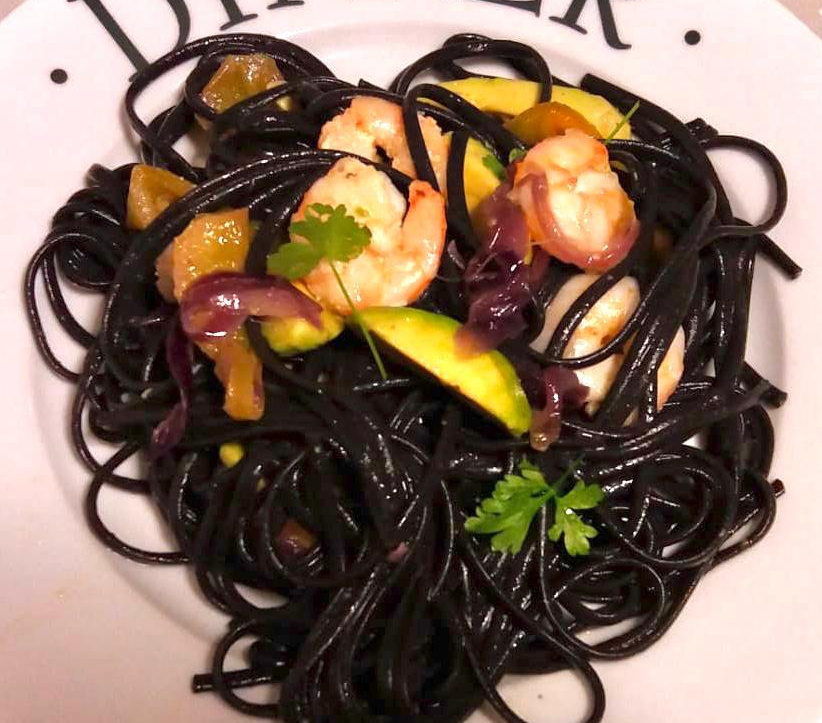 Junte o salteado do pimento e do camarão com o linguini. Descasque o abacate, fatie-o e regue com umas gotas de sumo de limão e coloque-o por cima do preparado anterior. Finalize com coentros grosseiramente picados.