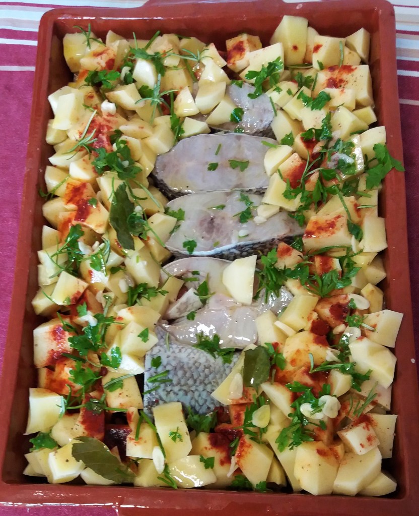 Colocar no forno a 180º C, periodicamente mexer as batatas e regar o peixe para não secar. Em cerca de 40 minutos estará pronto a servir.
