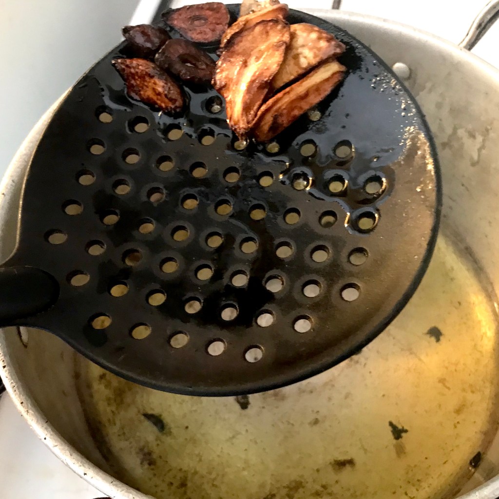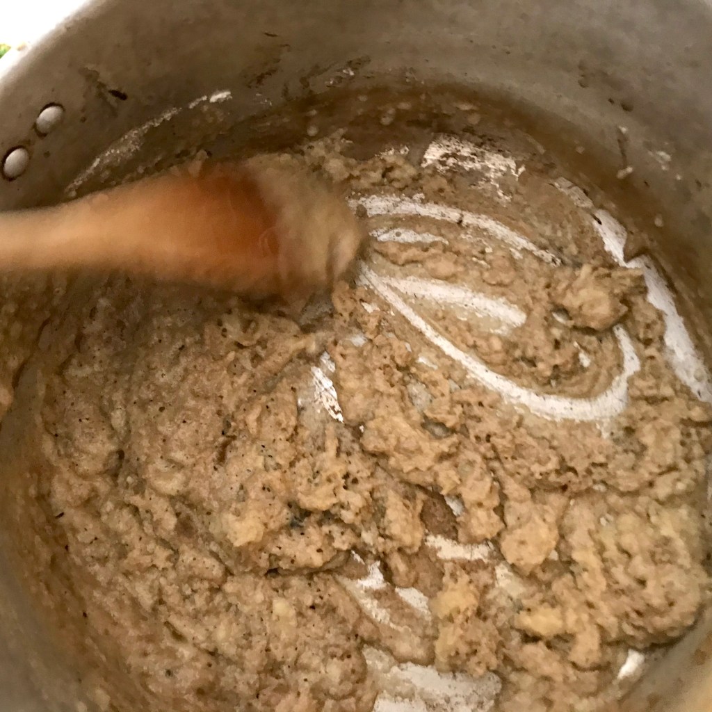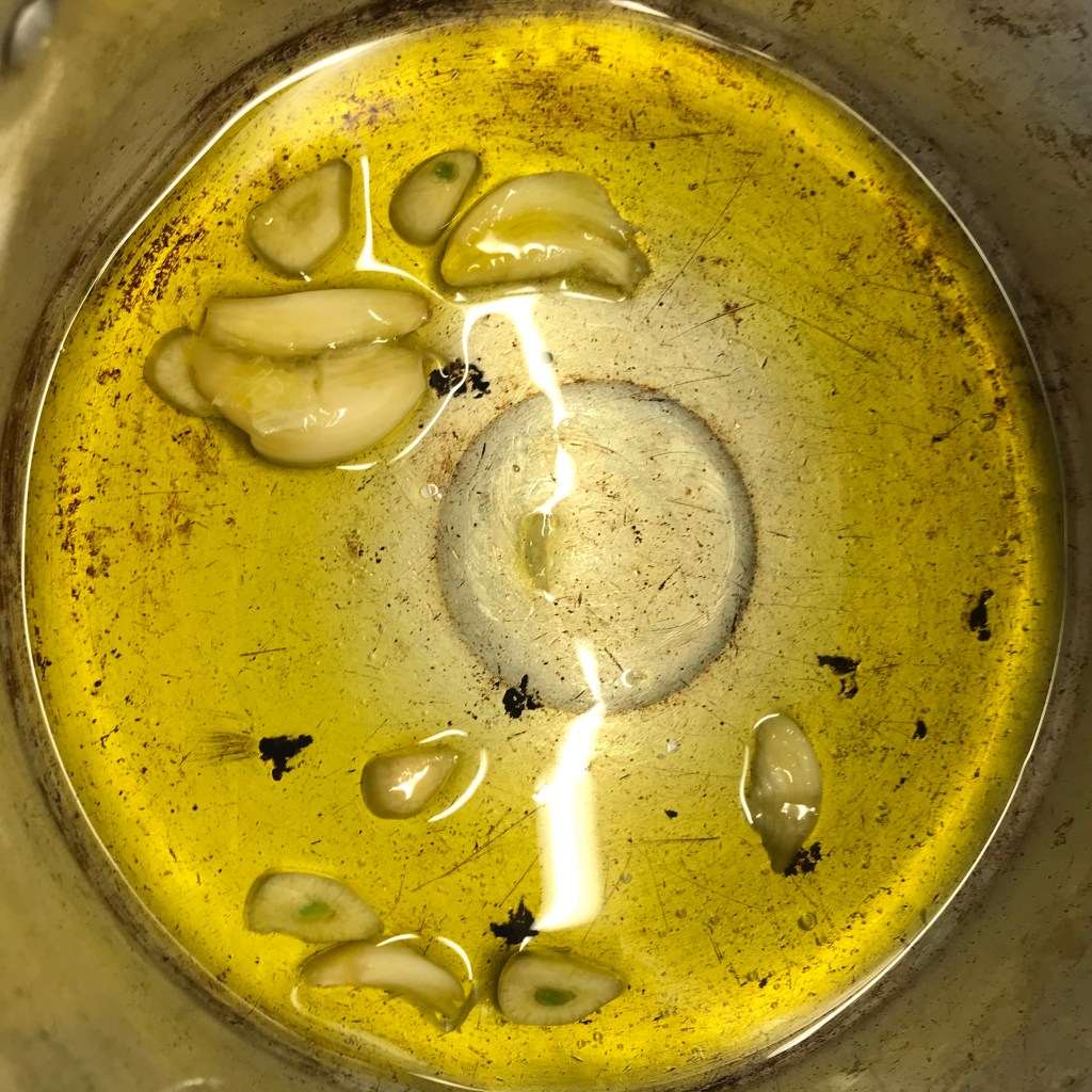 Forra-se o fundo do tacho com azeite e coloca-se 3 ou 4 dentes de alho cortados . Frita-se os alhos até ficarem queimados. Isto serve para que o azeite fique com sabor a alho. Depois de se retirarem os alhos, junta-se 3 colheres cheias de farinha, na panela com azeite. É necessário pôr o lume brando e ir mexendo, para que a farinha não queime.