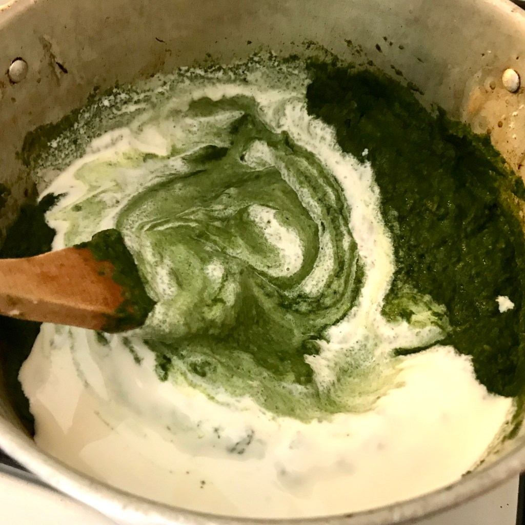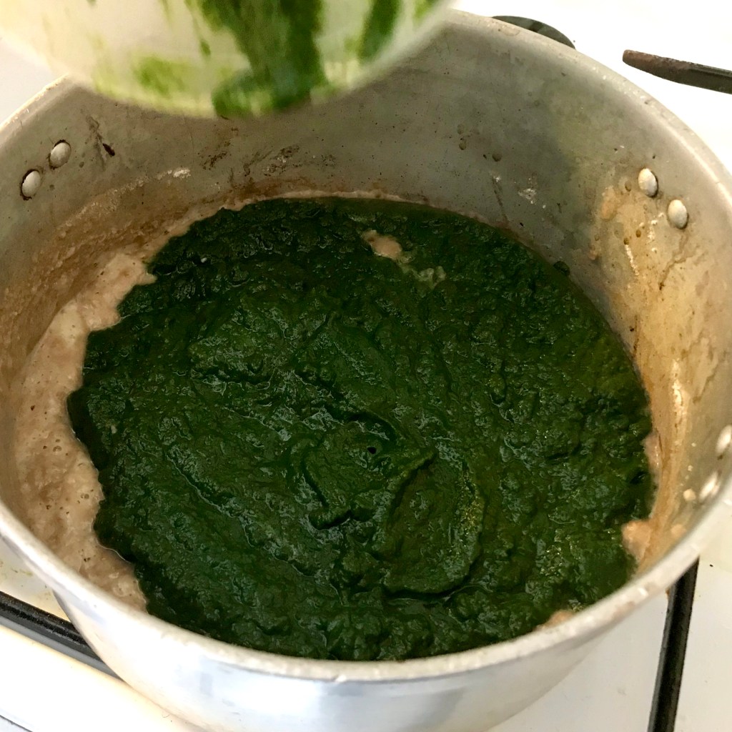Quando a farinha ficar da cor da bolacha Maria, junta-se os espinafres já moídos e mistura-se, adicionando sal a gosto. Vai-se juntando e misturando todo o pacote de natas ultrapasteurizadas. Sobe-se o lume para cozer as natas, dá-se umas voltas e retifica-se o sal. Depois, estará pronto a servir.
