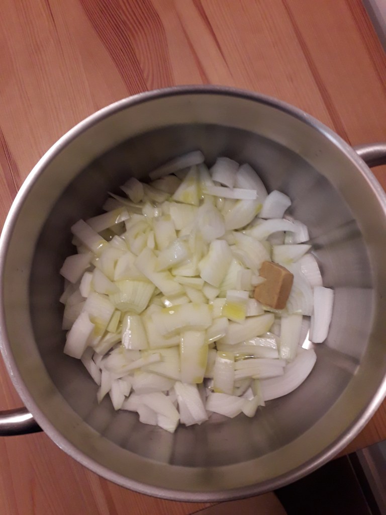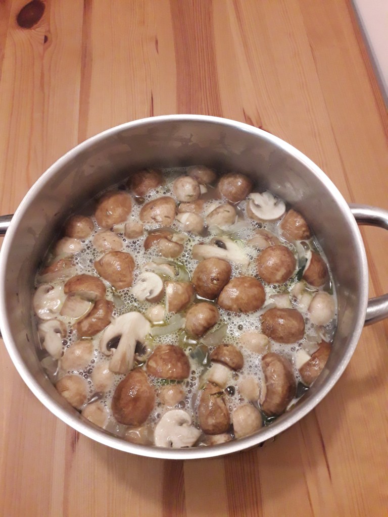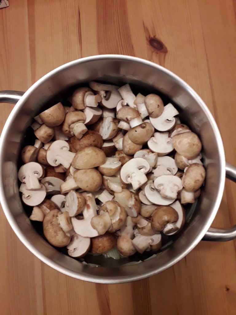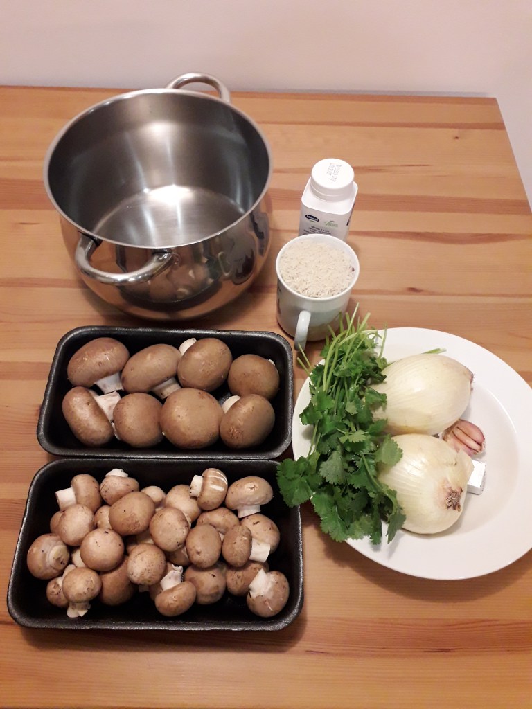 Descasque e corte fino as cebolas e as cabeças de alho e coloque tudo tudo numa panela. Junte um fio de azeite um pouco de sal e pimenta e leve a lume médio. Junte o caldo de galinha e deixe desfazer-se. Vá sempre mexendo. Lave os cogumelos e corte em 2 ou 4 e aqueça 1 lt. de água . Junte na panela os cogumelos e mexa durante 5 min. Junte o arroz e a água quente (3 medidas iguais à do arroz) e deixe ferver durante mais 7 min.