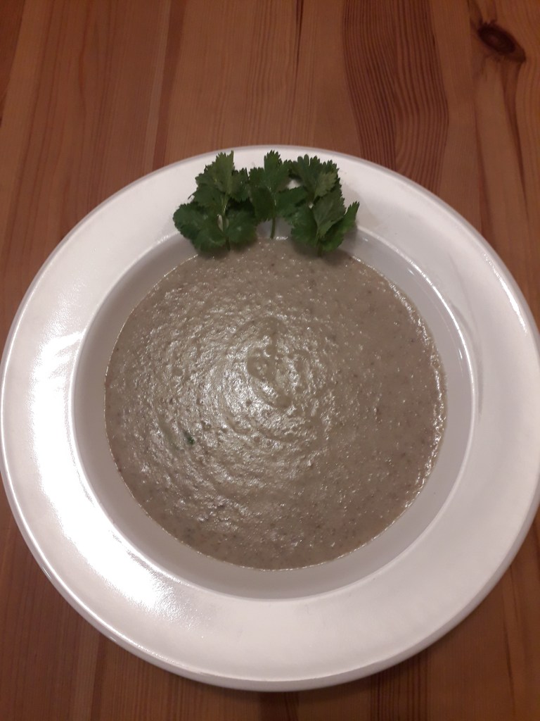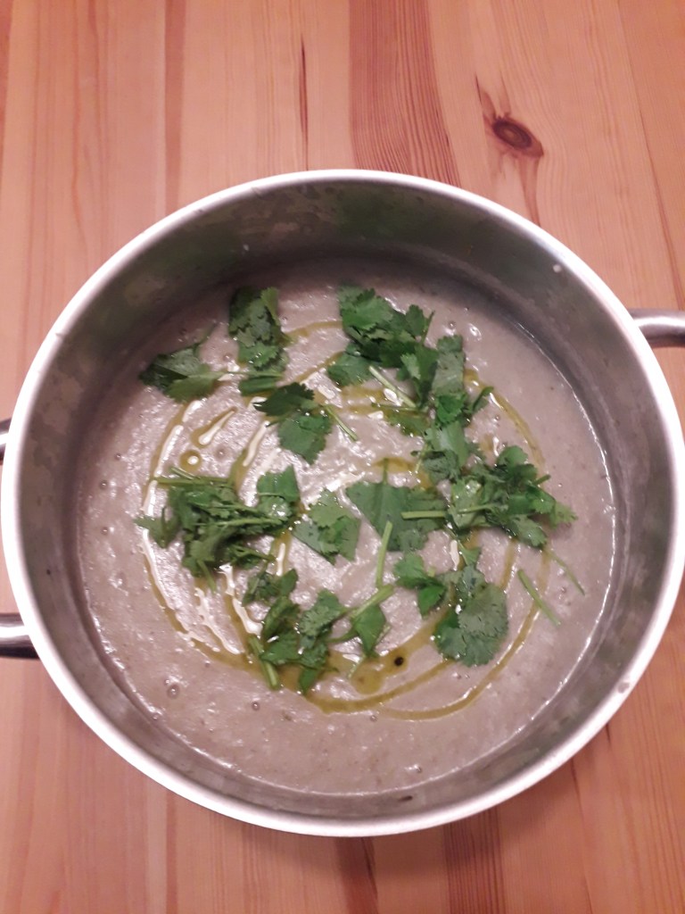 Com a varinha passe a sopa. Corrija os temperos e a água. Junte as natas e os coentros picados.