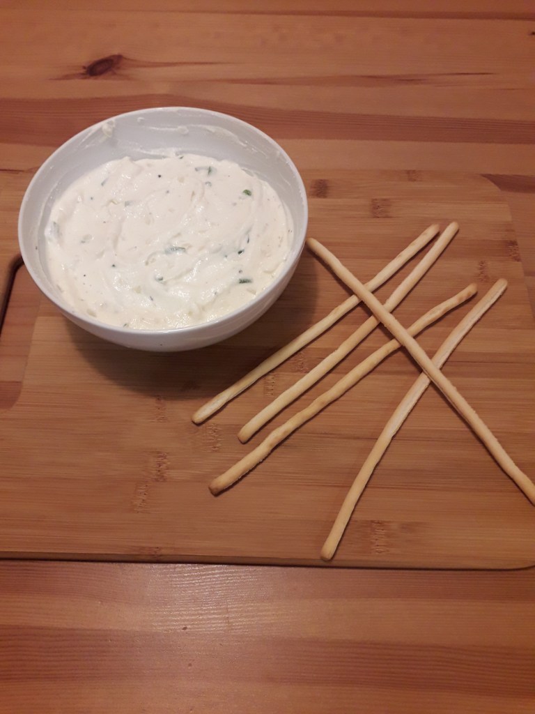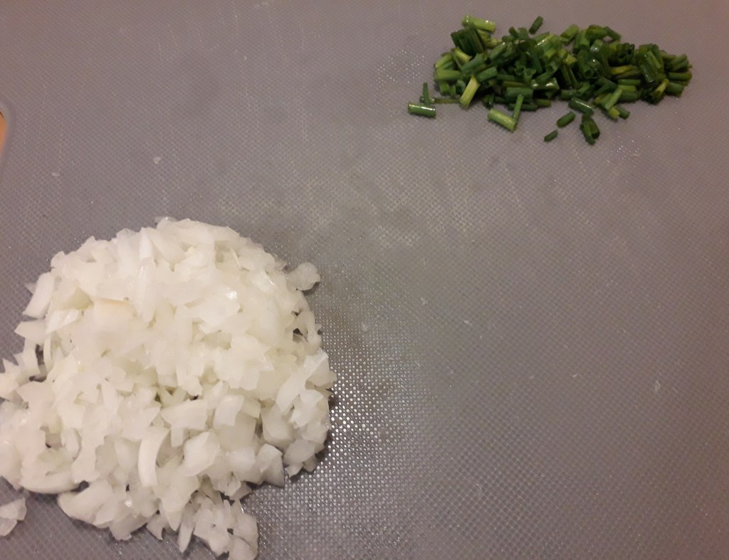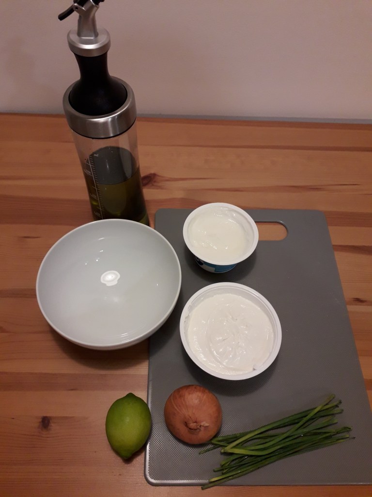 Juntar a ricota, o iogurte e o sumo de meia lima. Mexer até envolver tudo. Picar a cebola e o cebolinho. Misturar tudo e temperar com 1 fio de azeite, sal e pimenta.
