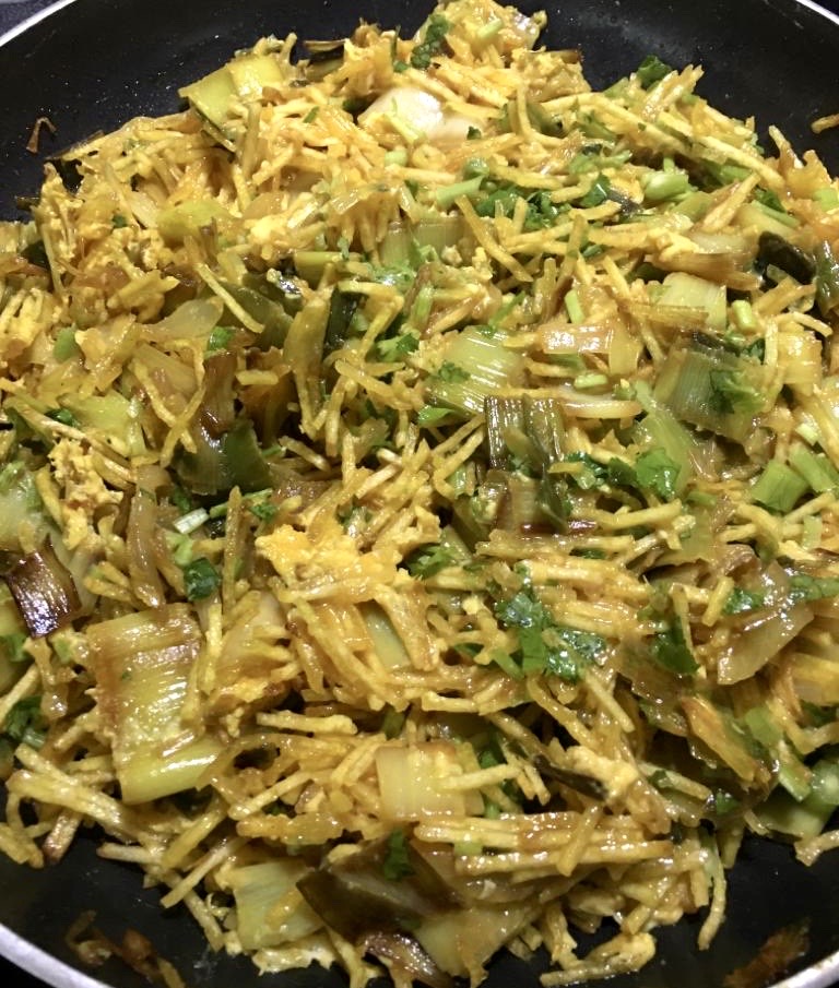 Junte as batatas palha e vá mexendo. Quando amaciarem um pouco, junto os ovos batidos e vá mexendo até estarem bem misturados e cozinhados. Por fim, junte a salsa ou os coentros picados. Sirva imediatamente.