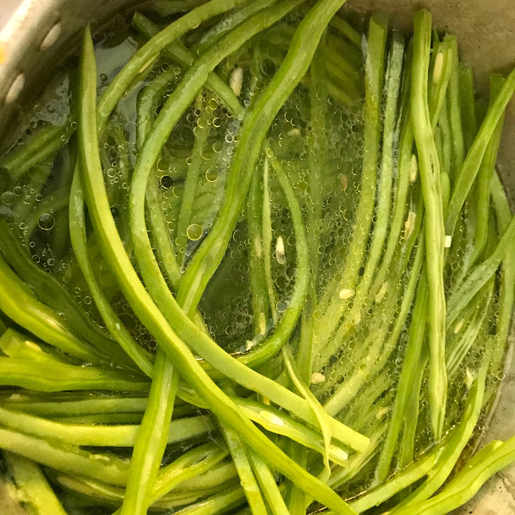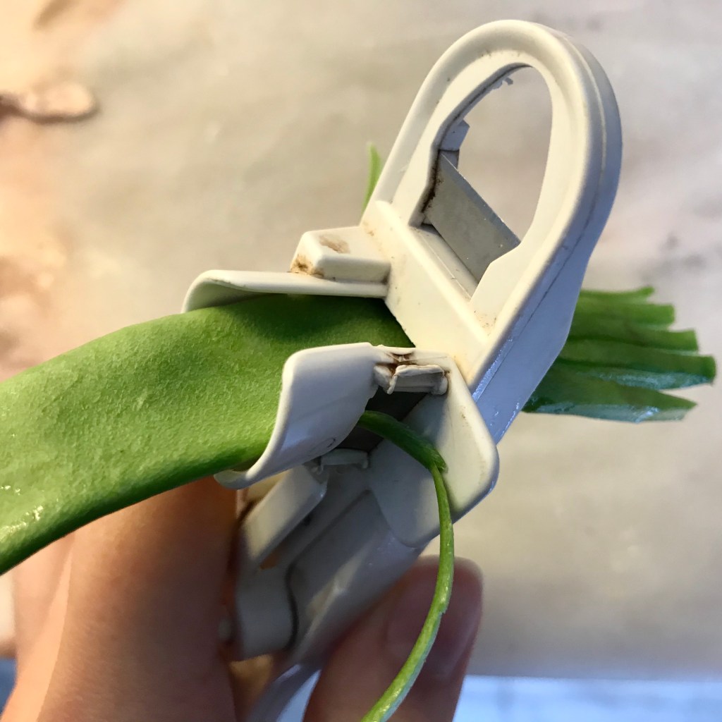 Coloca-se num tacho água com um fio de azeite e sal. Corta-se as pontas do feijão verde e com a ajuda do cortador, corta-se em tiras. Põe-se o feijão verde na água a ferver, quando voltar a levantar fervura junta-se meia colher de chá de bicarbonato de sódio e deixa-se cozer com o lume mais fraco mas sempre a ferver, porque se não não coze. O bicarbonato vai acelerar o processo. Depois de cozido desliga-se o lume e retira-se a água. Estará pronto a comer.